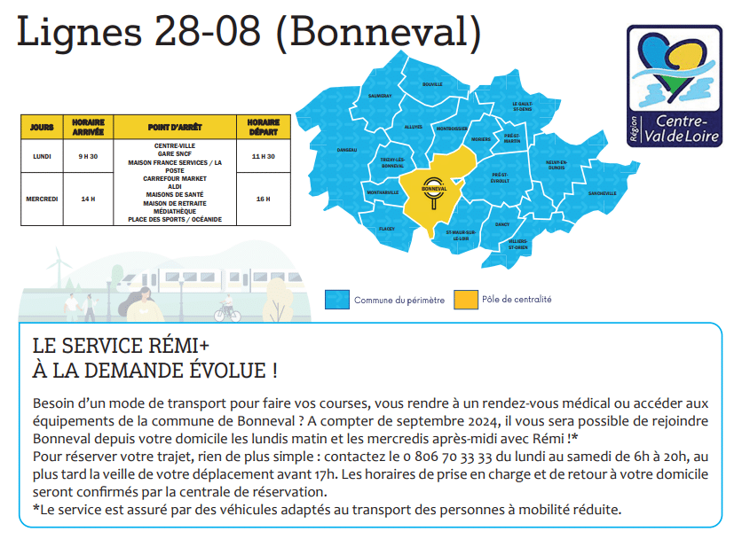 À partir de septembre 2024, le service Rémi+ évolue pour offrir un mode de transport aux habitants de Bonneval. Il permettra de faire des courses, d’aller à un rendez-vous médical ou d’accéder aux équipements communaux.
